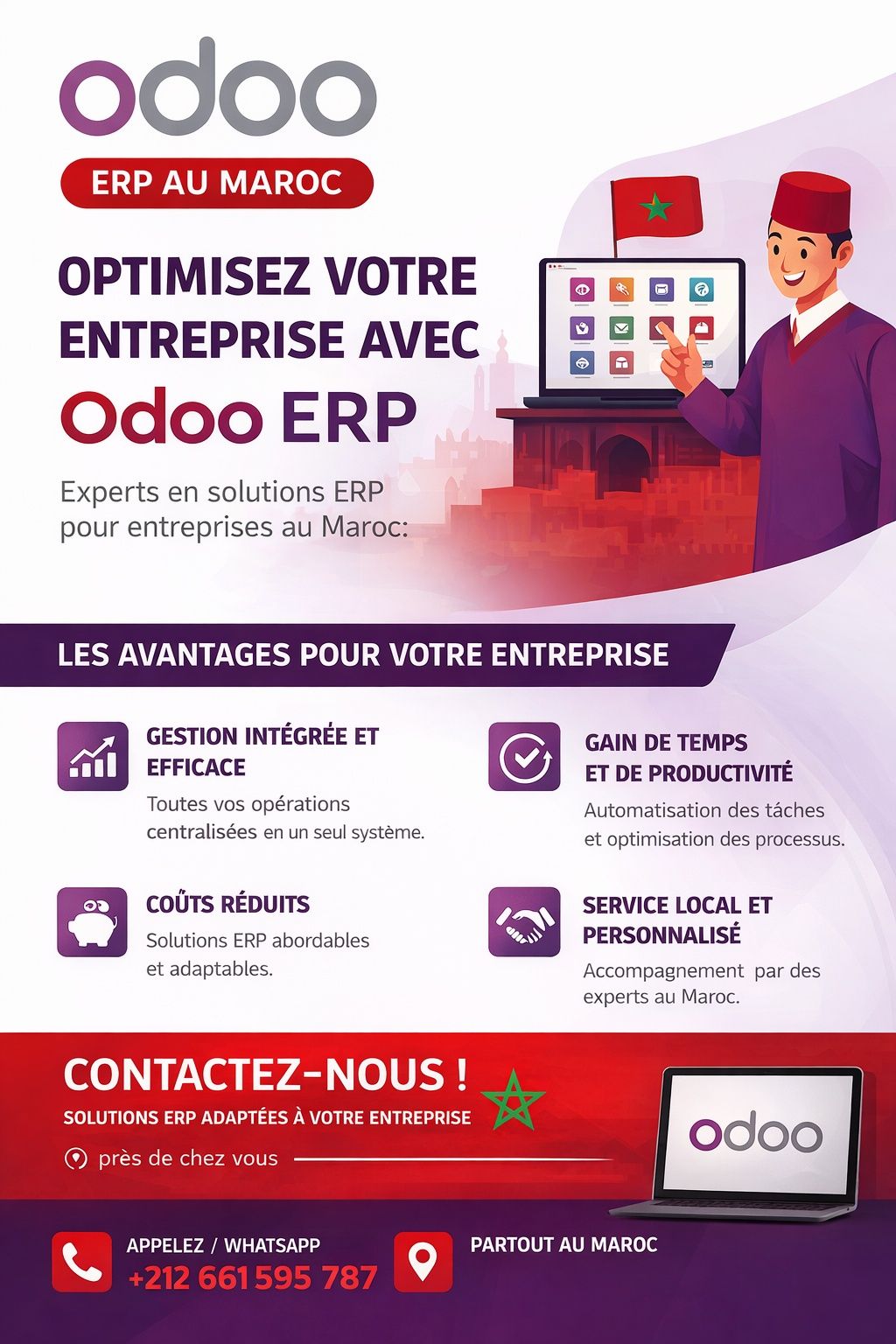 Puissant outil de gestion opérationnelle, modulable et pouvant s’adapter progressivement aux différents besoins de l’environnement concurrentiel d’aujourd’hui, Odoo est un progiciel de gestion intégré qui permet de prendre en charge toutes les fonctions de l’entreprise, y compris la gestion de projets et la communication transversale. Sa grande souplesse permet à Odoo de s’adapter à des profils très variés d’entreprises : de l’industrie au service en passant par les points de vente et le e-commerce.